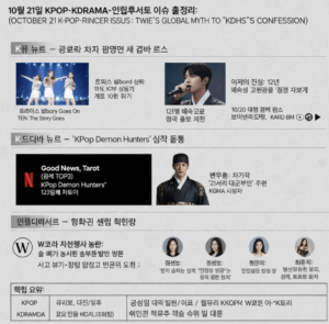 넷플릭스 애니메이션 ‘케이팝 데몬 헌터스’의 OST ‘골든’이 미국 빌보드 핫 100 차트에서 7주 연속 정상을 지켰고, OST 3곡이 동시에 5위권을 유지했다. 이 작품의 주인공 목소리 연기를 맡은 안효섭 배우가 미국 CBS 저녁 뉴스에서 한국문화를 알리며 긍정적 평가를 받았다.