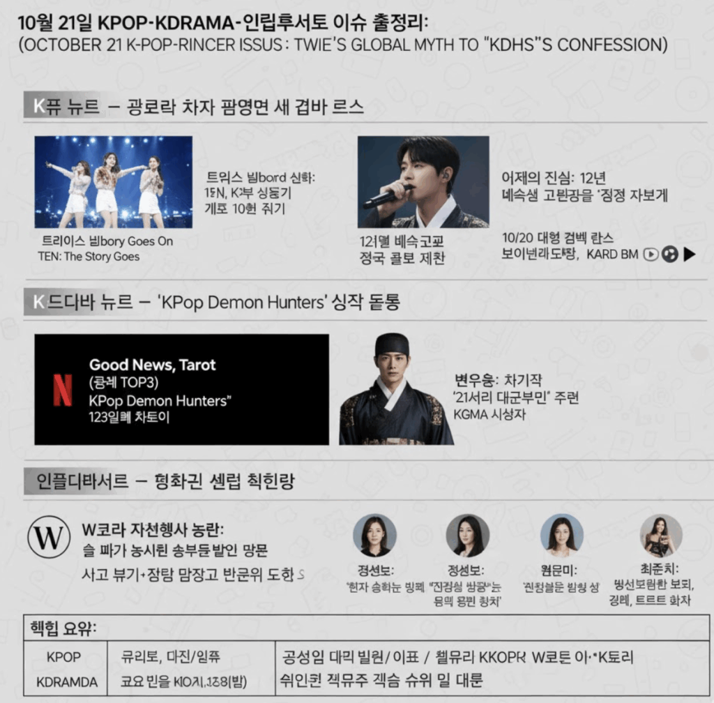 2025년 10월 21일 K팝, K드라마, 인플루언서 뉴스는 화려한 무대와 진정성 있는 스토리, 그리고 SNS 상의 사회적 논쟁이 함께 주목받은 날이었습니다. 트와이스의 빌보드 신기록, ‘케데헌’ 이재의 음악적 화제, W코리아 논란에 인플루언서들의 비판 등 다양한 현안이 화제를 모았습니다.